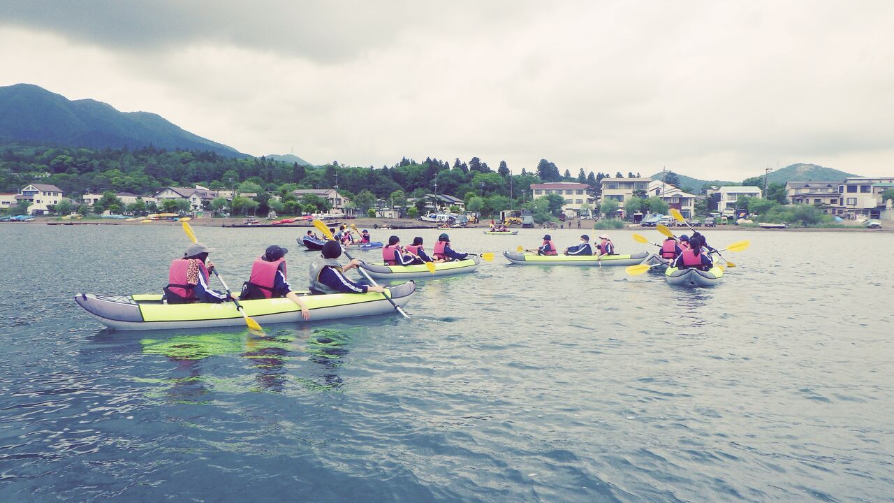 仲間と力を合わせ、山中湖を漕ぎ進む、、、
