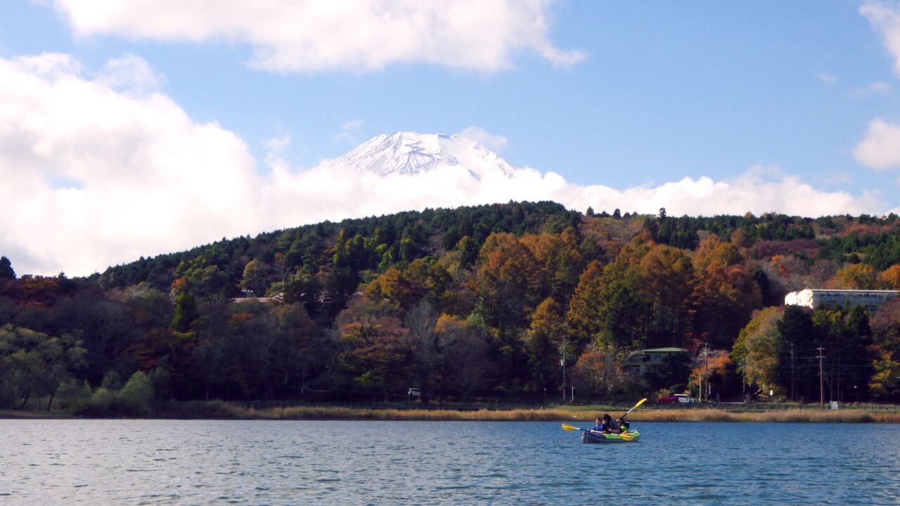 秋の紅葉眺めながらカヌー、笑